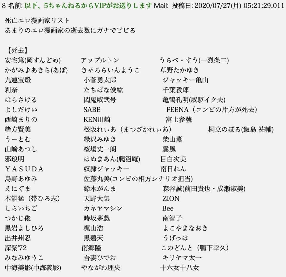 | … | 89無念Nameとしあき26/02/08(日)18:58:37No.1385868351>そもそも雑誌掲載もご無沙汰で人付き合いも無いエロ漫画家とかは亡くなってても何もわからんしな |