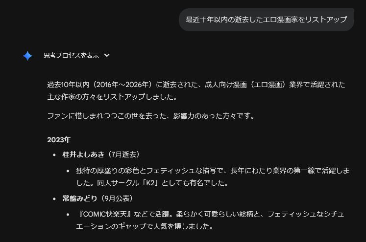 | … | 85無念Nameとしあき26/02/08(日)18:55:13No.1385867511そもそも雑誌掲載もご無沙汰で人付き合いも無いエロ漫画家とかは亡くなってても何もわからんしな |