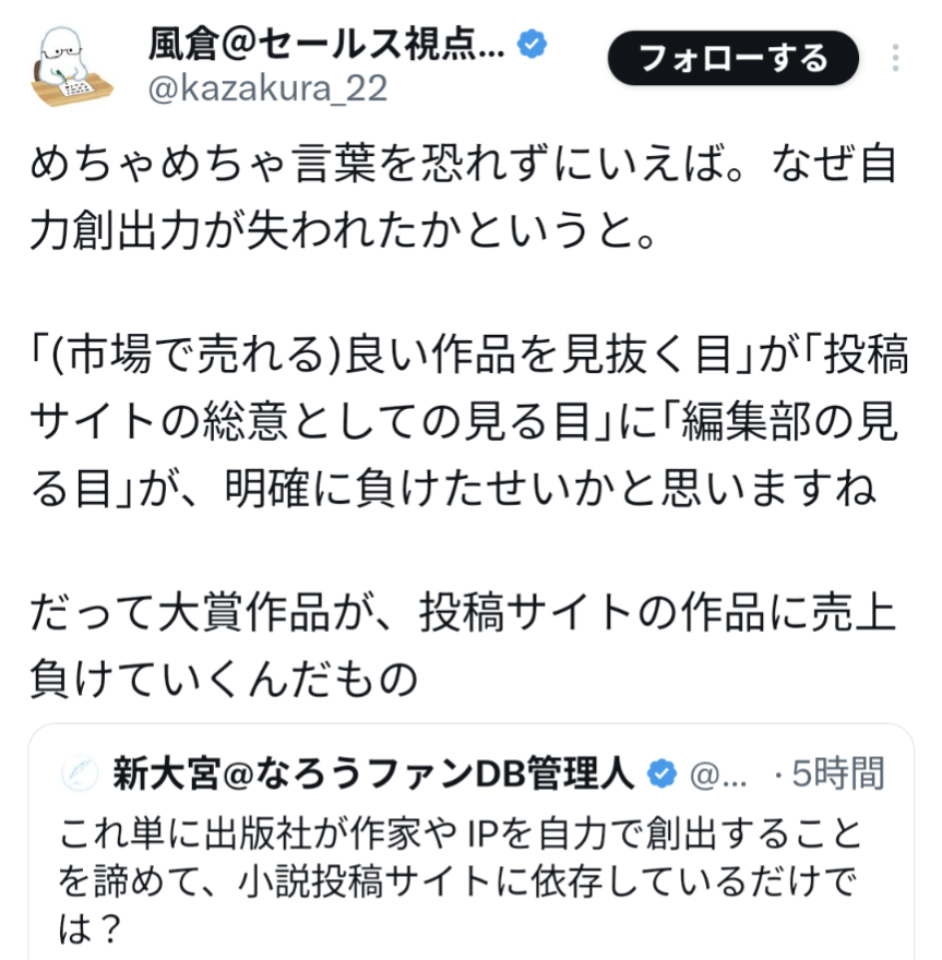 | … | 51無念Nameとしあき26/02/09(月)14:25:00No.1386130861出版社がちゃんと良いものを見出して作らせて売り出そうという意識を失うなら当然素人たちの投稿サイトに負けるわ |