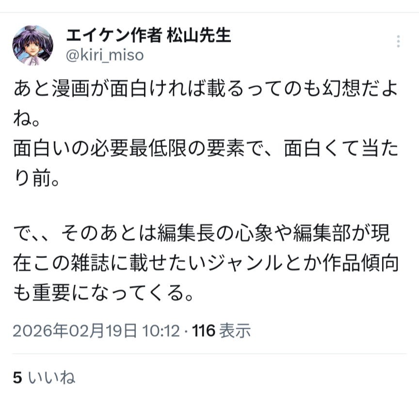 | … | 55無念Nameとしあき26/02/19(木)12:32:16No.1388442656>正直申し上げますと一回お色気漫画を当てた程度の方が凄い事言ってるなと |