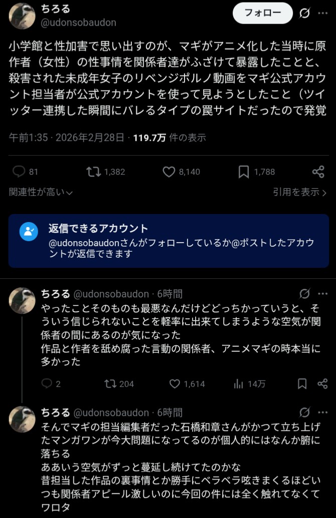 | … | 34無念Nameとしあき26/02/28(土)06:25:15No.1390508010反社会的な外道が小学館と結託して被害者蔑ろにしてた上にのうのう連載続けて今そこから作家が大量離脱ってスレに性犯罪を叩くな守るぞって来てもID出るに決まってるだろ |