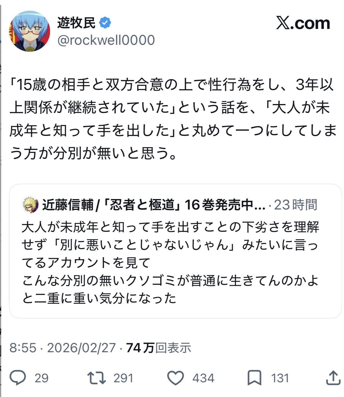 | … | 28無念Nameとしあき26/02/28(土)06:05:59No.1390507087>引用とか見てると普段こういうのにあんまり加わらないガチのプロの方々が批判してて今までの炎上沙汰との次元の違いを感じる |