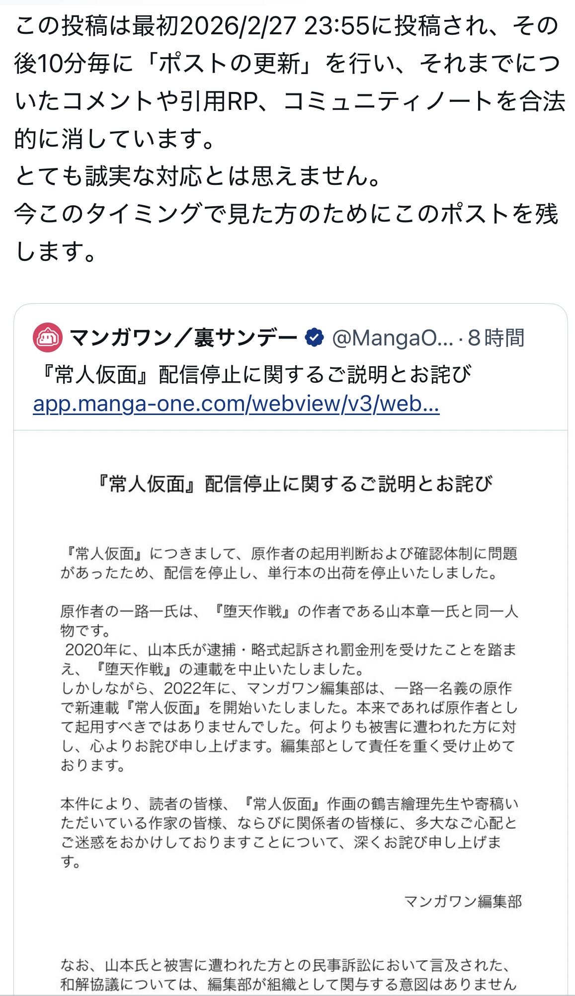 | … | 987無念Nameとしあき26/02/28(土)10:24:20No.1390536108経緯がよくわからんのだけど堕天作戦はマンガワンではなかった? |