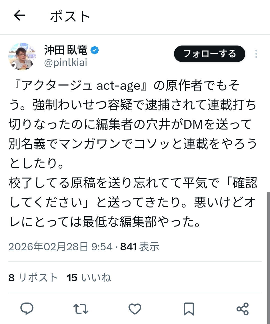 | … | 71無念Nameとしあき26/02/28(土)07:01:18No.1390510154>小学館は何を思ってアクタージュの事件見てたんだろう |