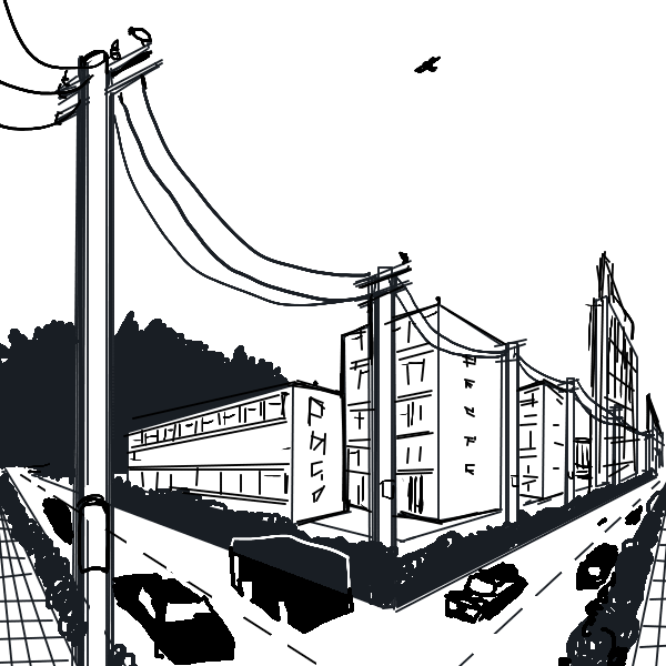 アイレベルが手前の電柱と奥の建物で違ってるように見えるからかな |